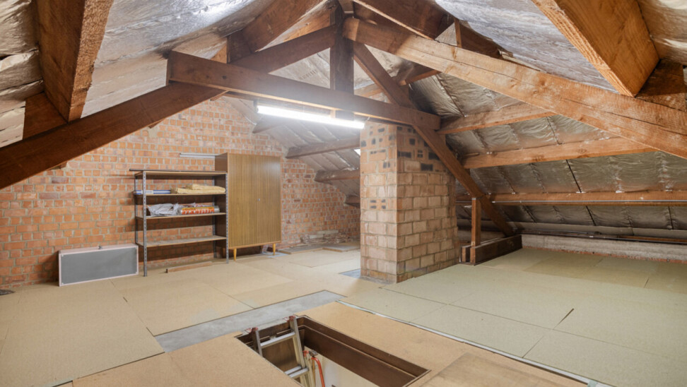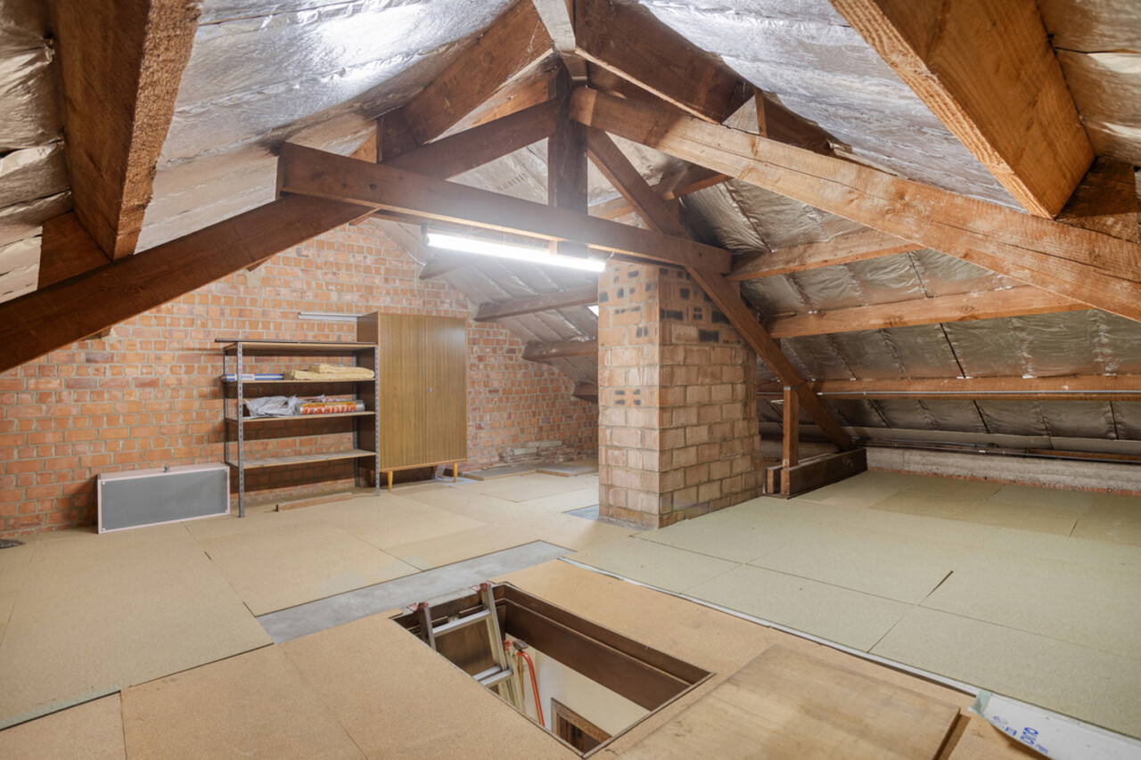 La maison dispose également d’un garage avec porte automatique et d’une buanderie/espace de rangement. À l’étage, vous trouverez trois chambres de 10 m², 14 m² et 18 m² ainsi qu’une salle de bains spacieuse. Un grenier d’environ 40 m², accessible par escalier escamotable, offre de nombreuses possibilités.