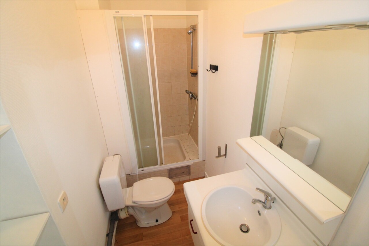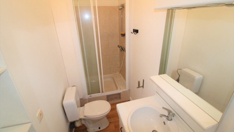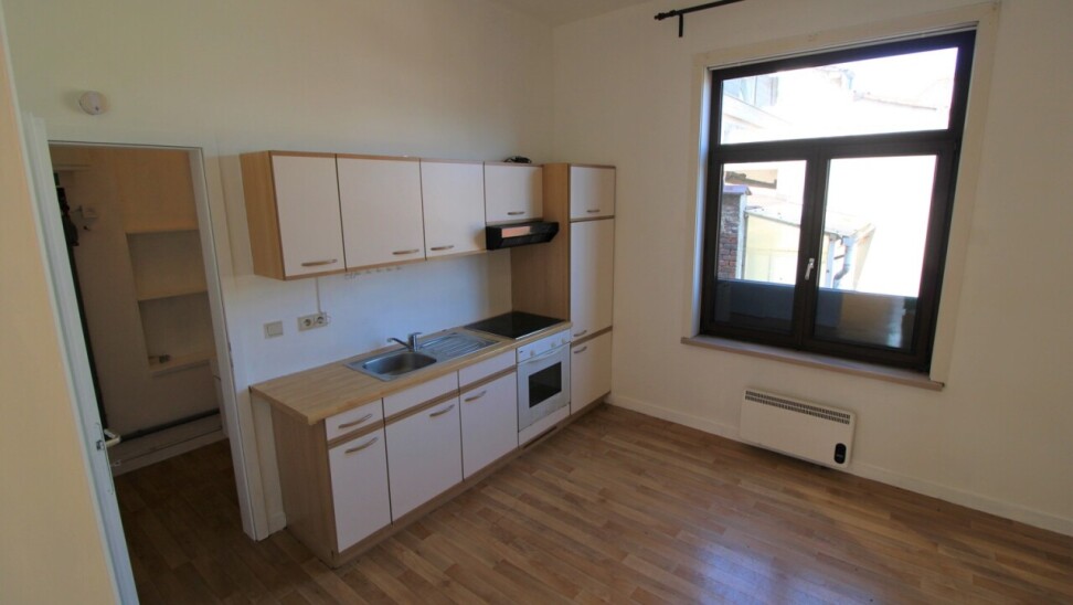 La salle de bain séparée contient un lavabo avec armoire encastrée, toillette et douche. La cuisine se trouve à l'arrière du bâtiment et est equippée avec des plaqques vitro-céramiques, hotte, four, frigo et évier. Le living emplit dans la lumière naturelle grâce aux hautes fenêtres.