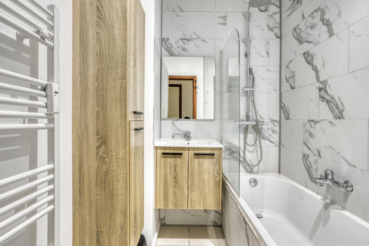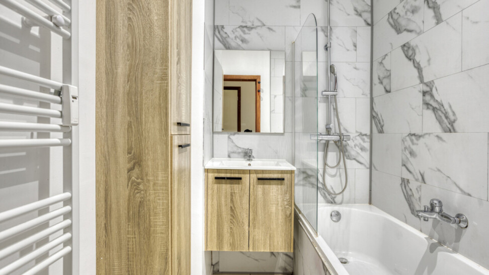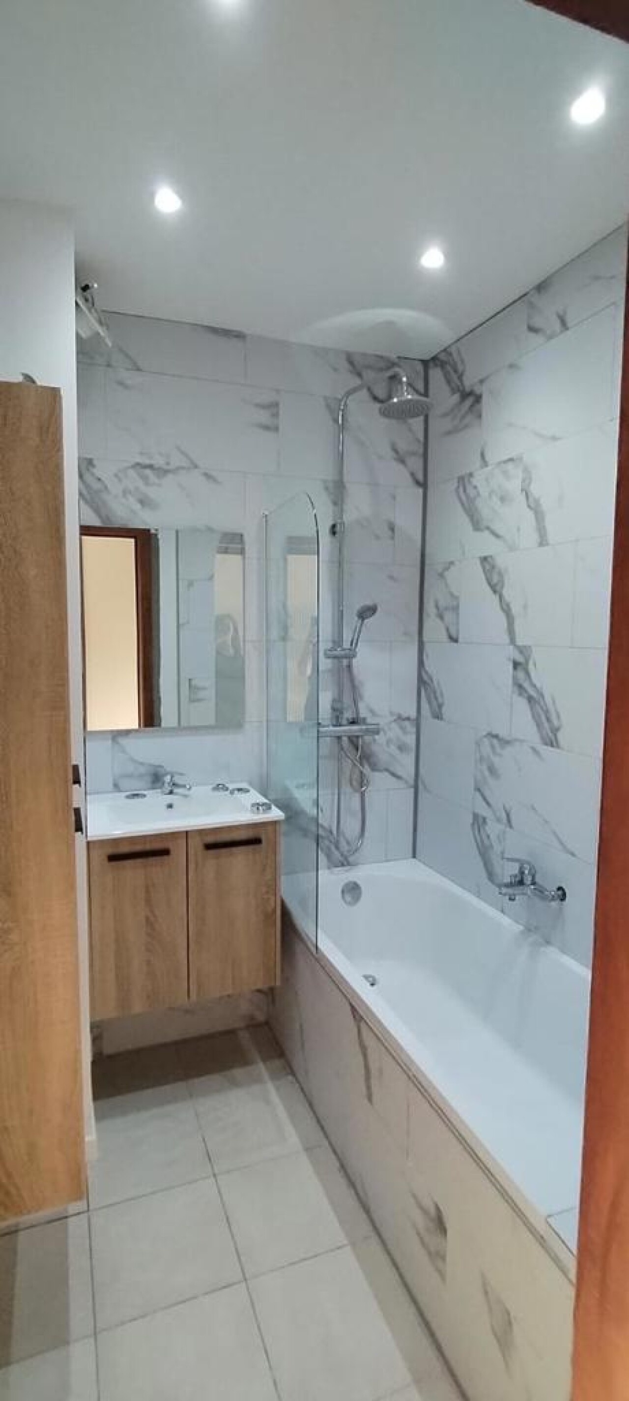 De moderne badkamer is smaakvol afgewerkt. Er zijn twee slaapkamers: één van 14 m² en één van 8 m² – ideaal voor een koppel, klein gezin of wie extra ruimte wenst.