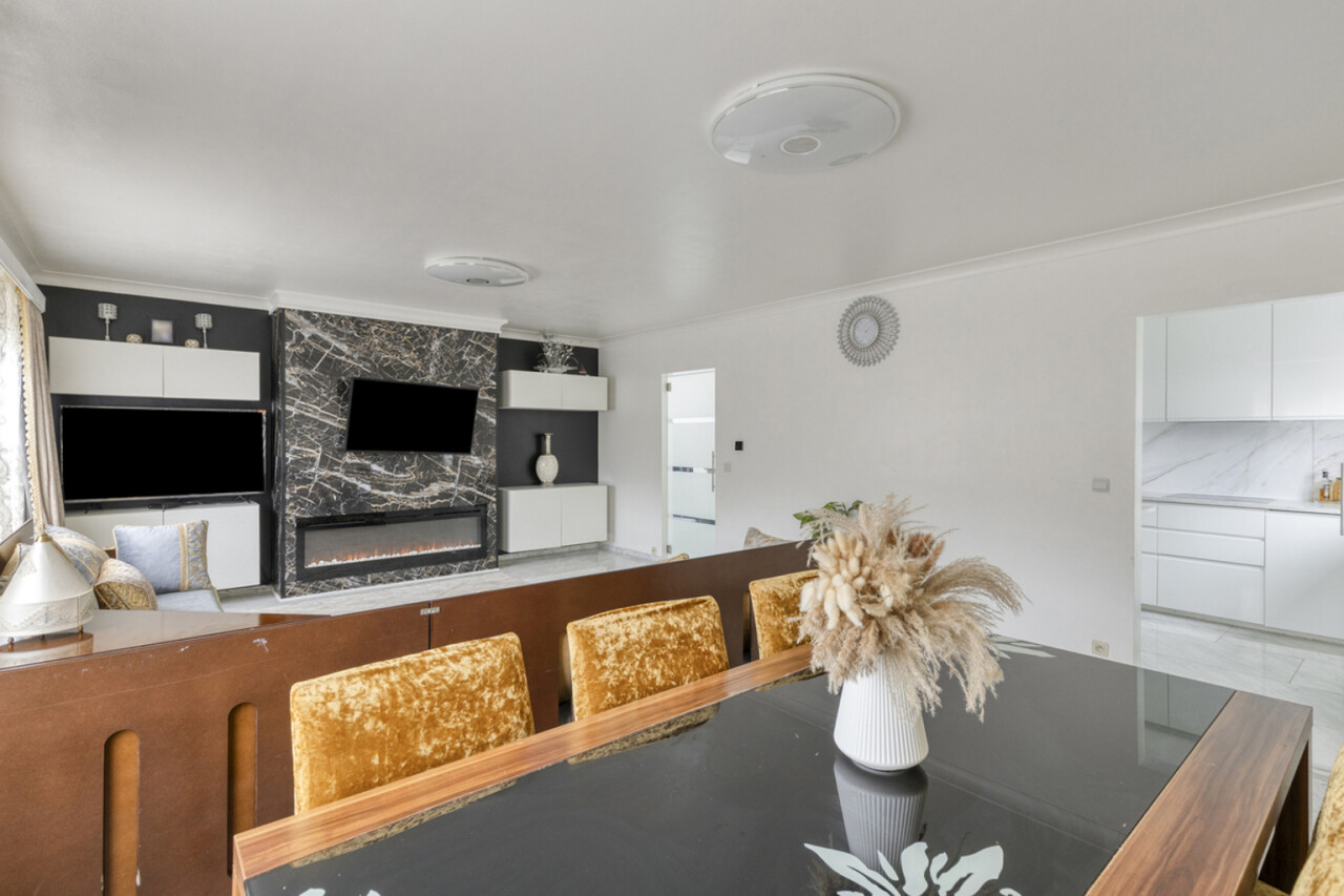 Via de ruime inkomhal met vestiairekast betreedt u de lichtrijke living van 35 m² met gezellige open haard. Aansluitend vindt u de volledig ingerichte gesloten keuken van 9 m².