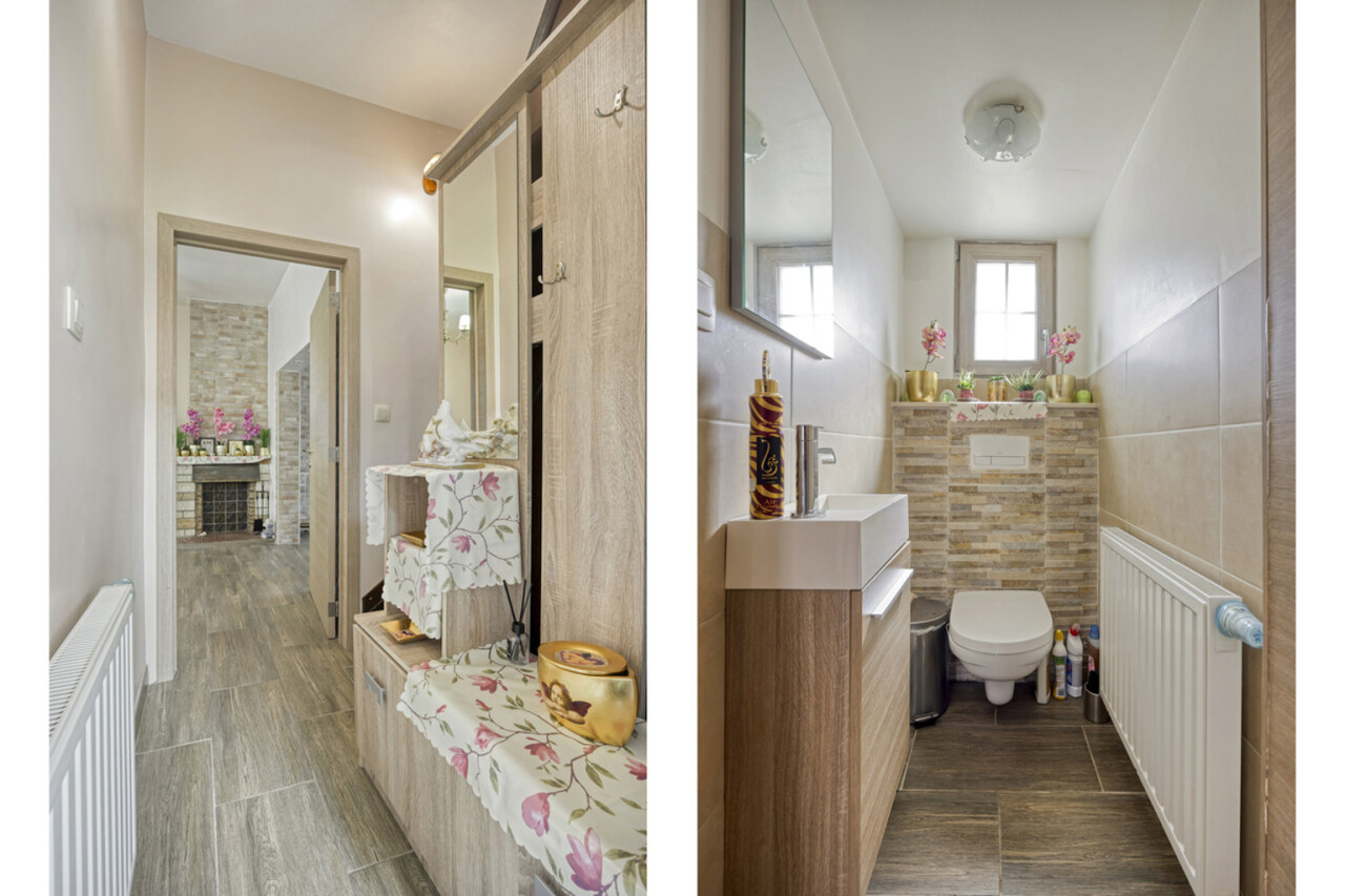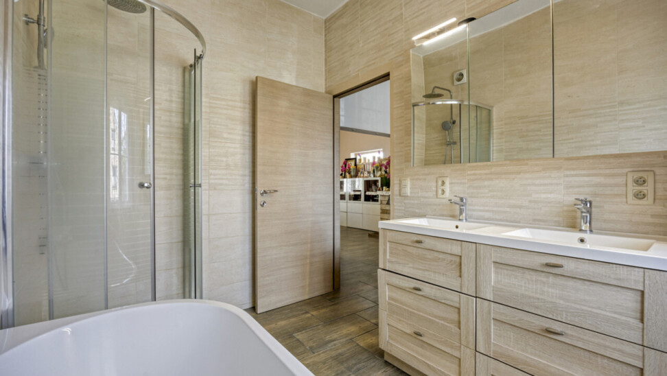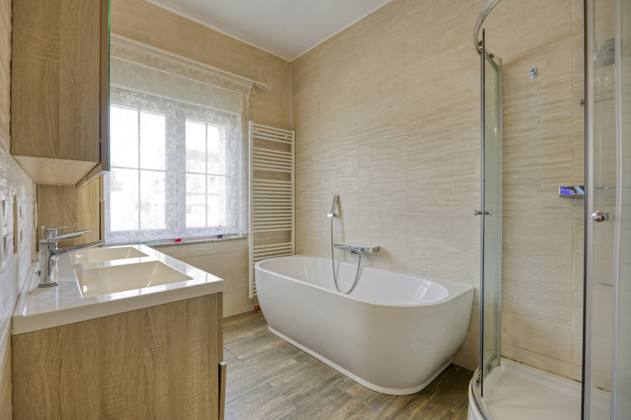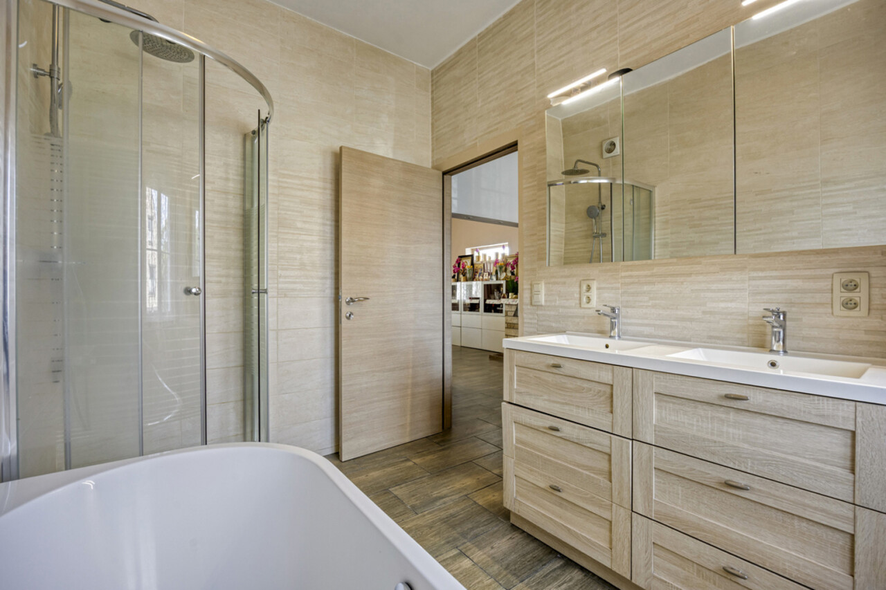 Op het gelijkvloers vindt u tevens een praktische badkamer met ligbad, douche en dubbele lavabo, evenals een apart toilet – een duidelijke meerwaarde voor het dagelijks comfort.
