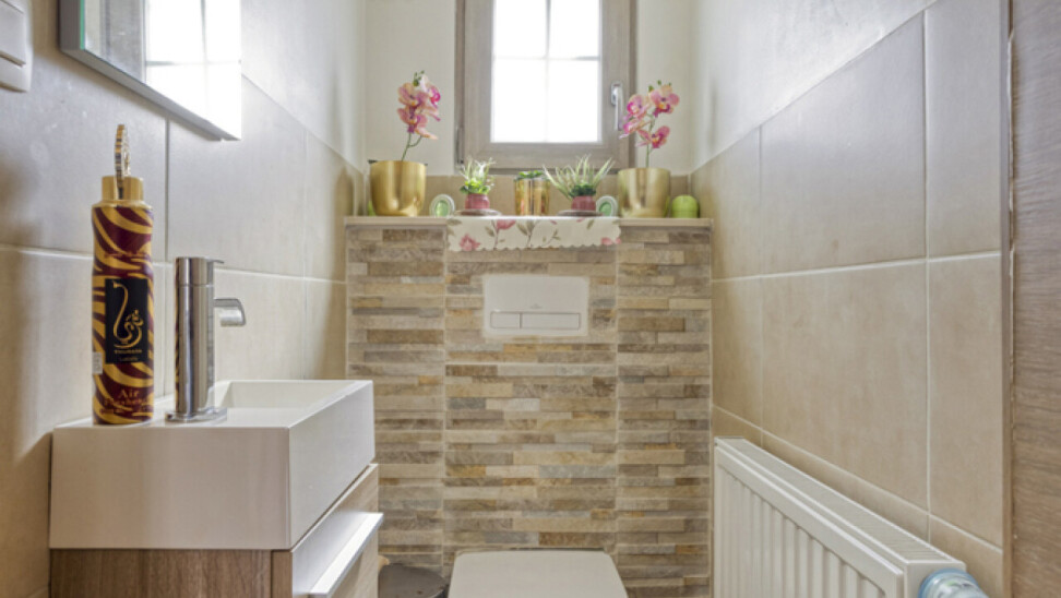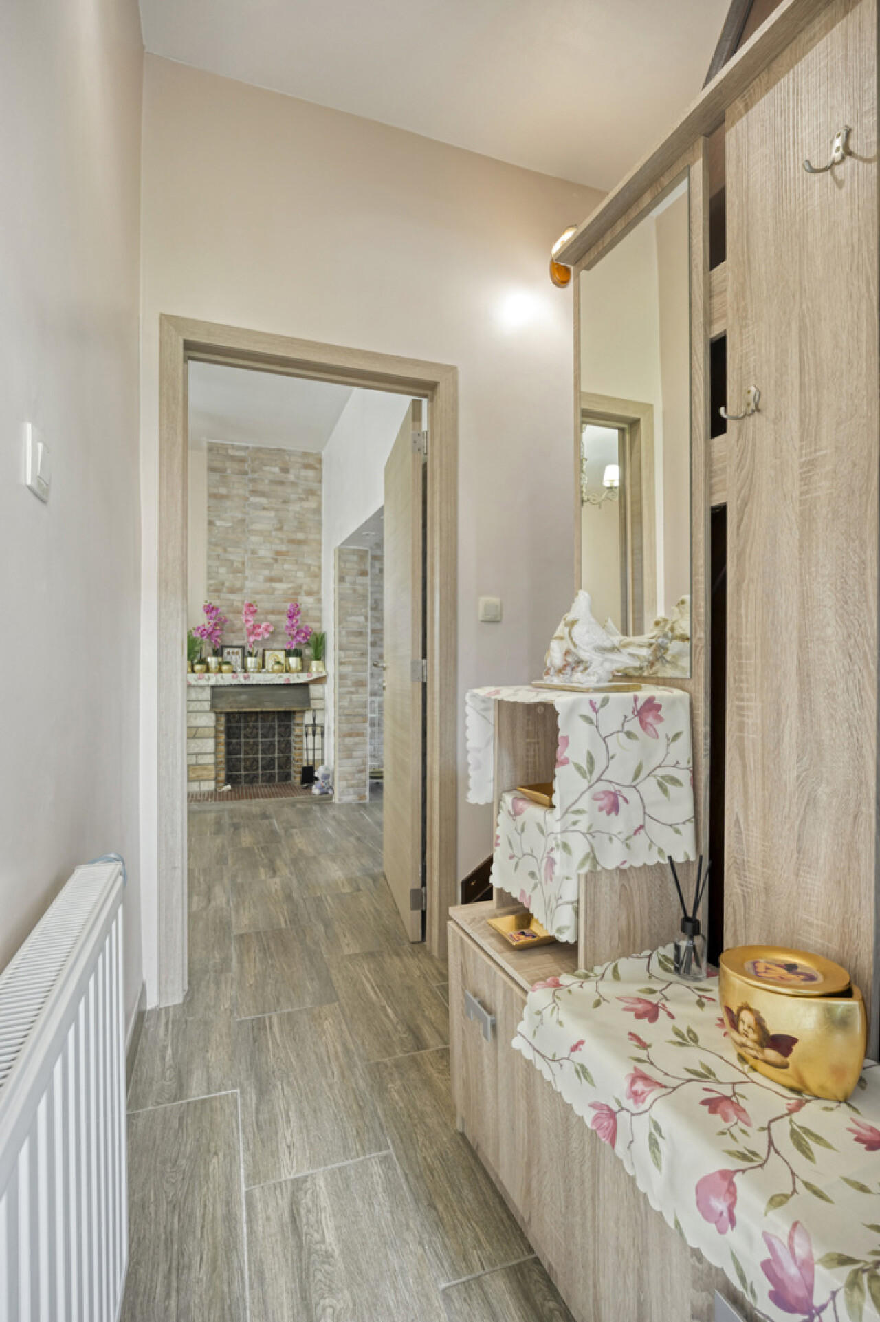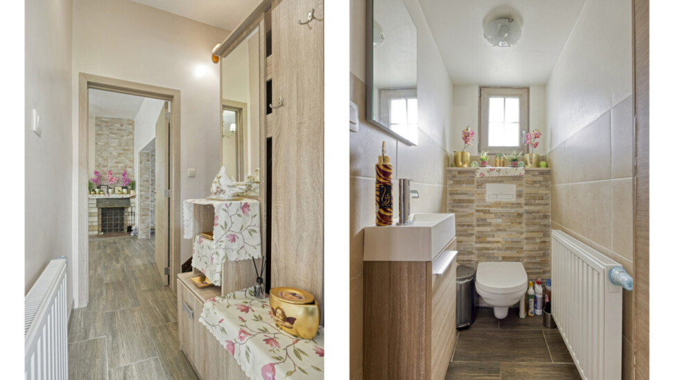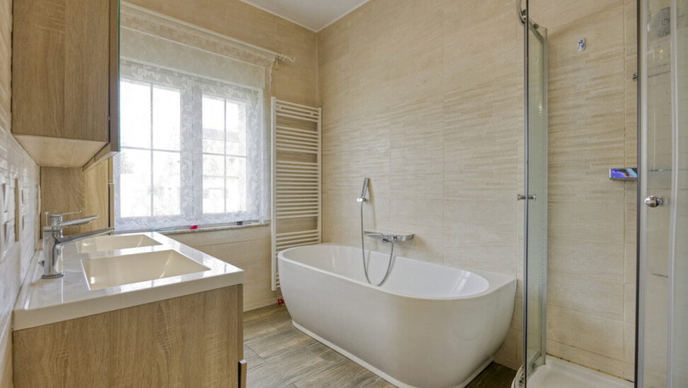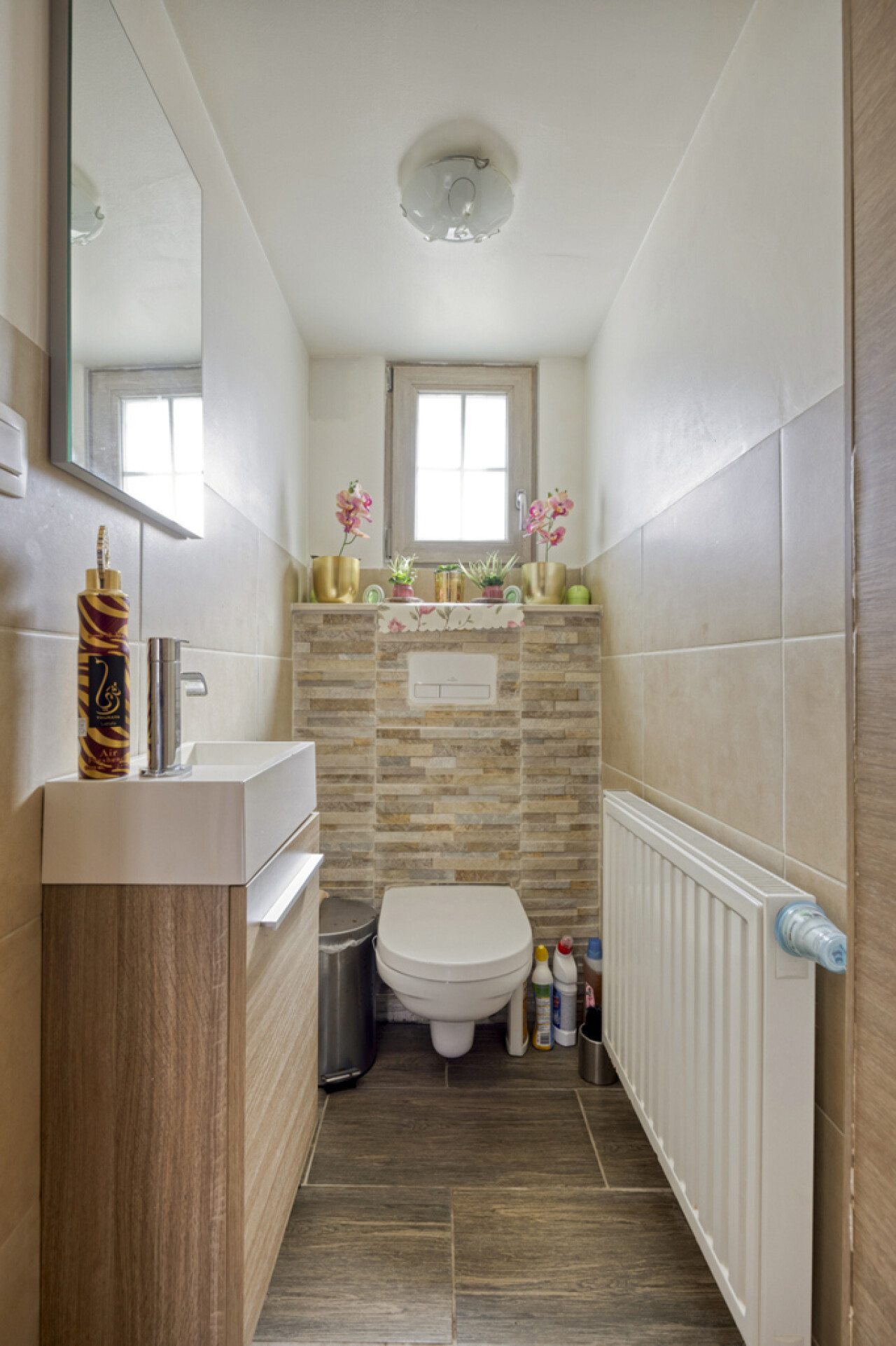 Op het gelijkvloers vindt u tevens een praktische badkamer met ligbad, douche en dubbele lavabo, evenals een apart toilet – een duidelijke meerwaarde voor het dagelijks comfort.