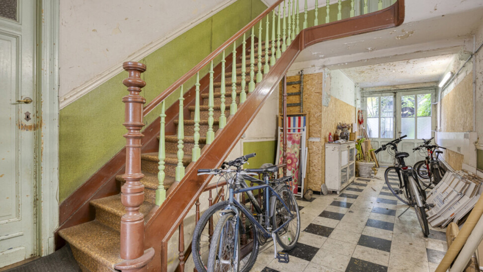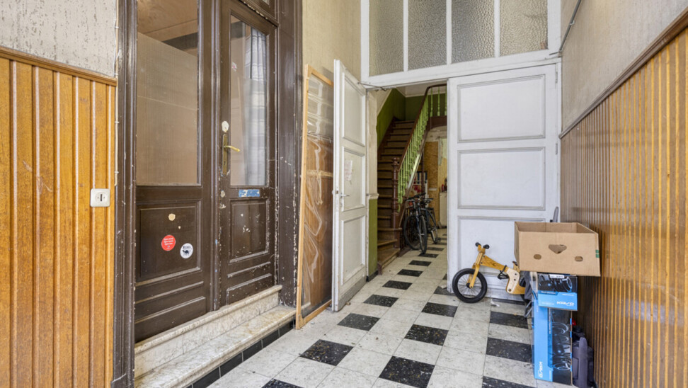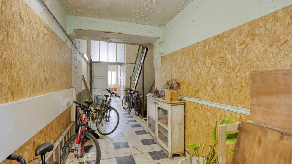 Hoofdgebouw straatkant: indeling: rechts: Inrijpoort (+/- 10m²) , inkomhal en traphal (+/- 26m²) uitgevend op een achterliggende koer (+/- 27m²).