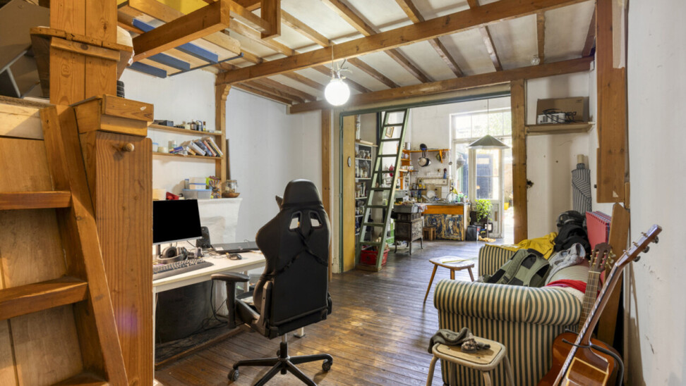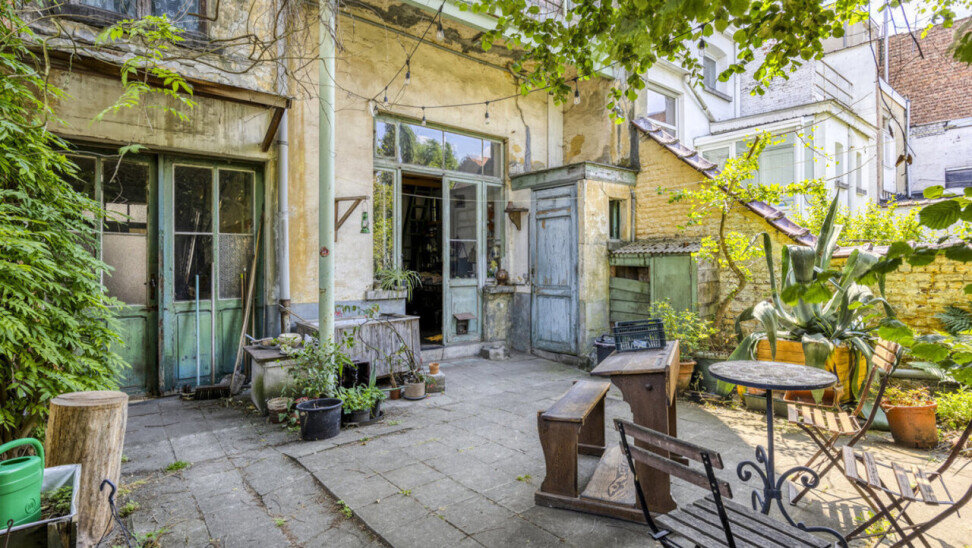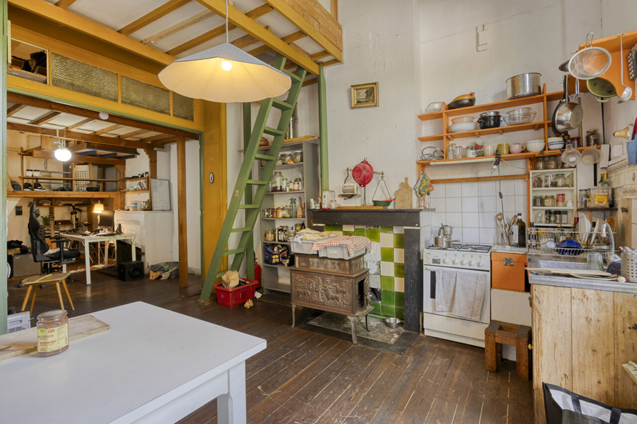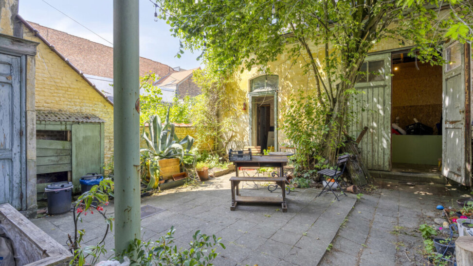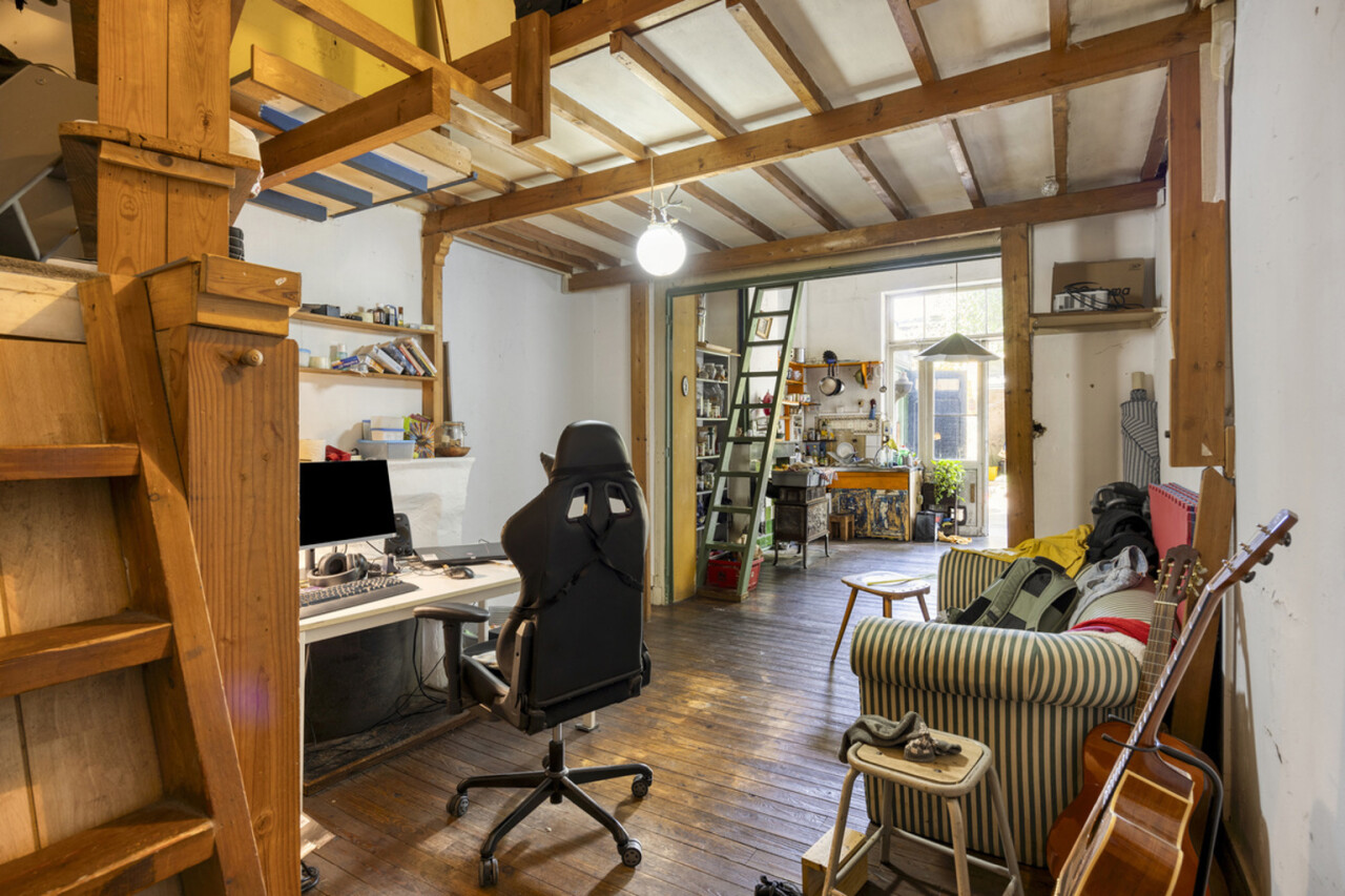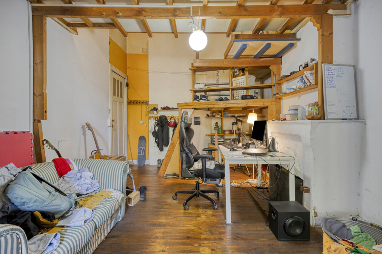 Werkplaats achterin hoofdgebouw gelegen. Indeling: bestaande uit 3 niveau's: tuinniveau (-1) (+/- 64m²), straatniveau (+/- 64m²) en zolderniveau (+/- 50m²).